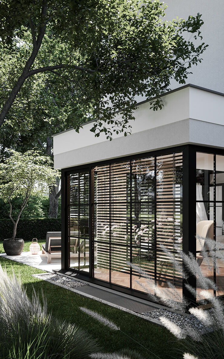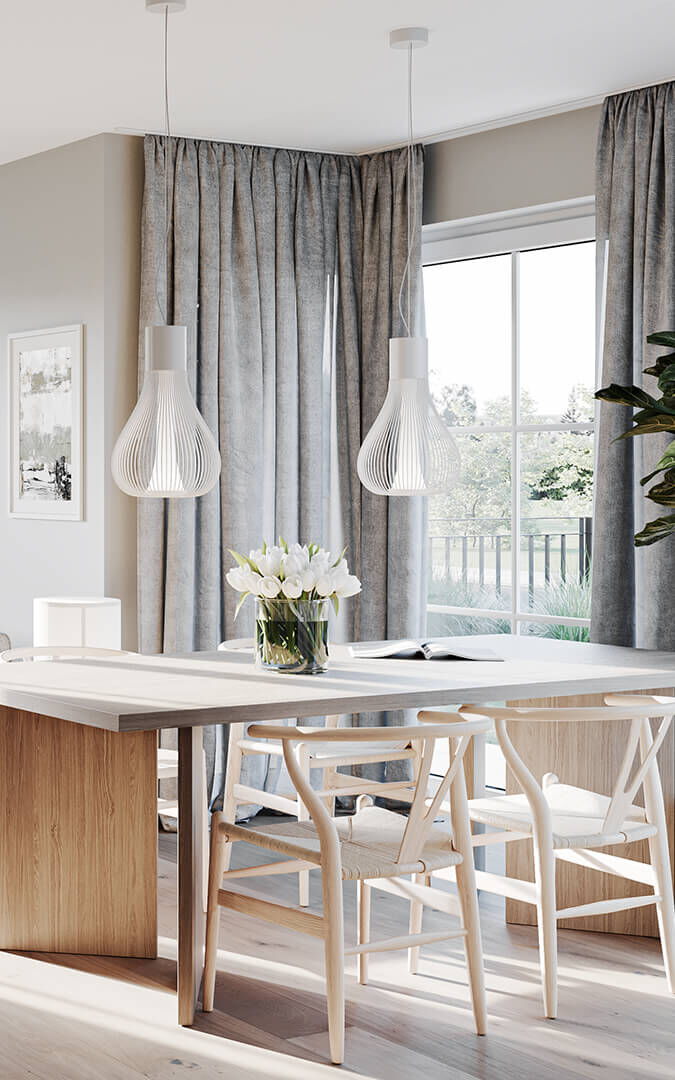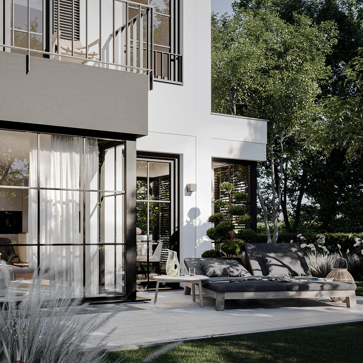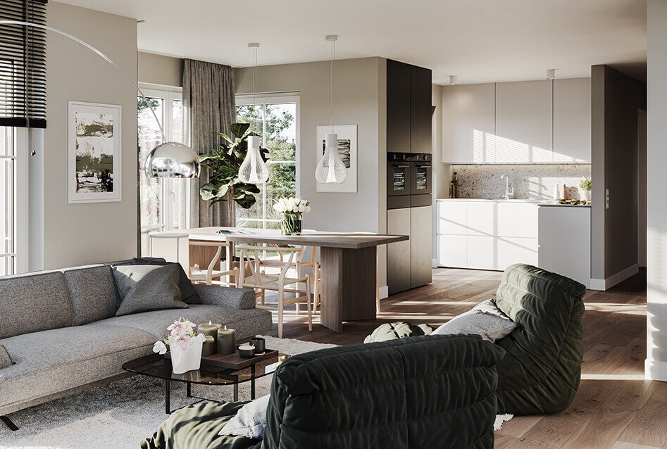 Jedes der Häuser verfügt über einen großzügigen Wohn- und Essbereich mit offener Küche, vier Zimmer in den oberen Geschossen, zwei Tageslichtbäder, ein Gäste-WC und weitere Räume im Untergeschoss. Ein zusätzliches Bad oder eine Sauna sind auf Wunsch möglich.